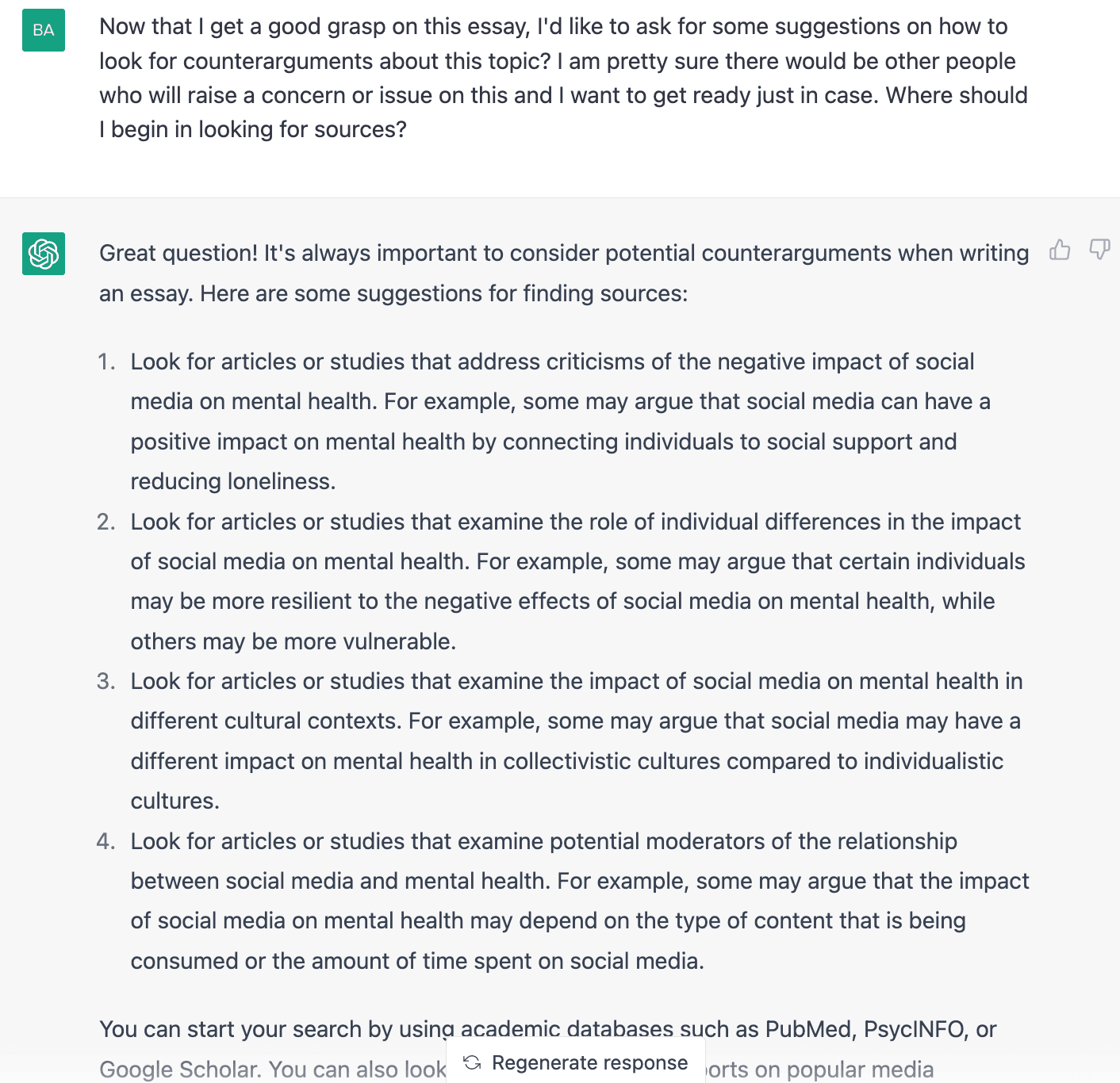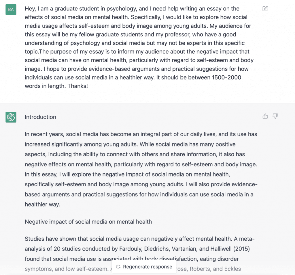 Review the output once ChatGPT has created a draft of your essay. If necessary, you can personalize the essay further by making refinements and adjustments to the draft generated by ChatGPT. This includes adjusting the language, structure, and tone to meet your preferences and the unique needs of your essay. You can generate another response by clicking on “Regenerate Response” at the bottom of the screen. You can also edit your prompt by clicking on the Edit button on the right side of your prompt and then clicking “Save and Submit” once you’re done. The example below is a follow-up question for the prompt in Step 2:
