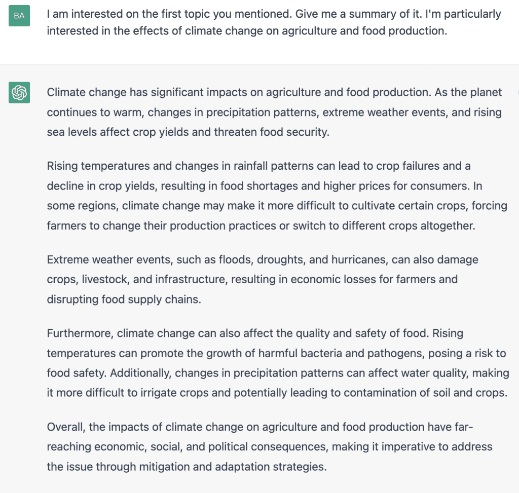 After exploring the topic suggestions provided by ChatGPT, the next step is to ask for a brief or summary of the topics that interest you. This will give you a better understanding of each topic and help you decide which one to choose for your essay. ChatGPT can provide a concise summary of each topic, including key points and main arguments.