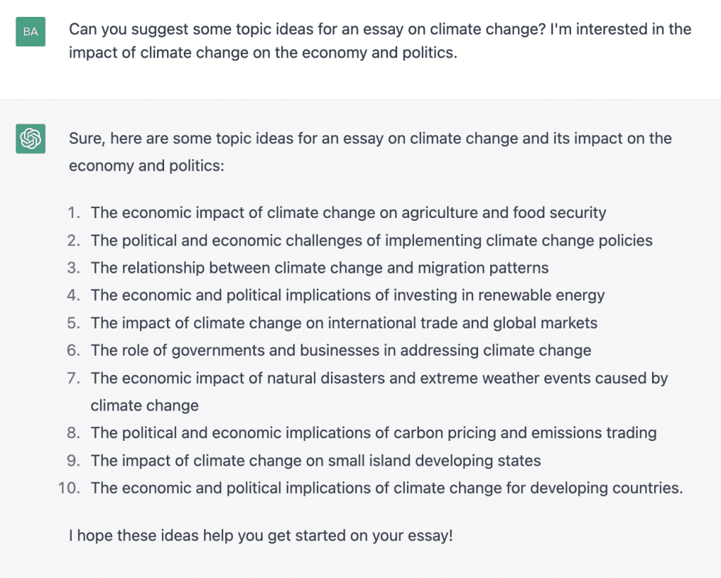You can ask ChatGPT to suggest topic ideas if you’re having a hard time coming up with one. Provide related keywords that you want ChatGPT to focus on when it suggests topic ideas. Remember, the key to a successful essay is choosing a topic that you are interested in and can write about with authority.