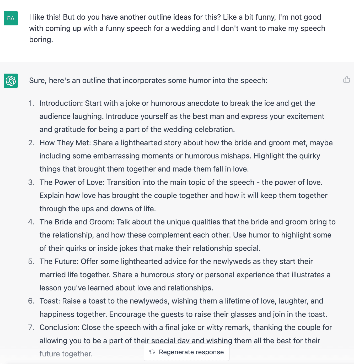 After ChatGPT has generated the speech based on your prompt, review the output. If you need to personalize the speech further, you can make refinements and adjustments to the draft generated by ChatGPT. This includes tweaking the language, structure, and tone to suit your preferences and the unique needs of your speech. You can regenerate another response by clicking on “Regenerate Response” at the bottom of the screen. You can also edit your prompt by clicking on the Edit button on the right side of your prompt and then clicking “Save and Submit” once you’re done. Here’s a follow-up question for the prompt on Step 2: