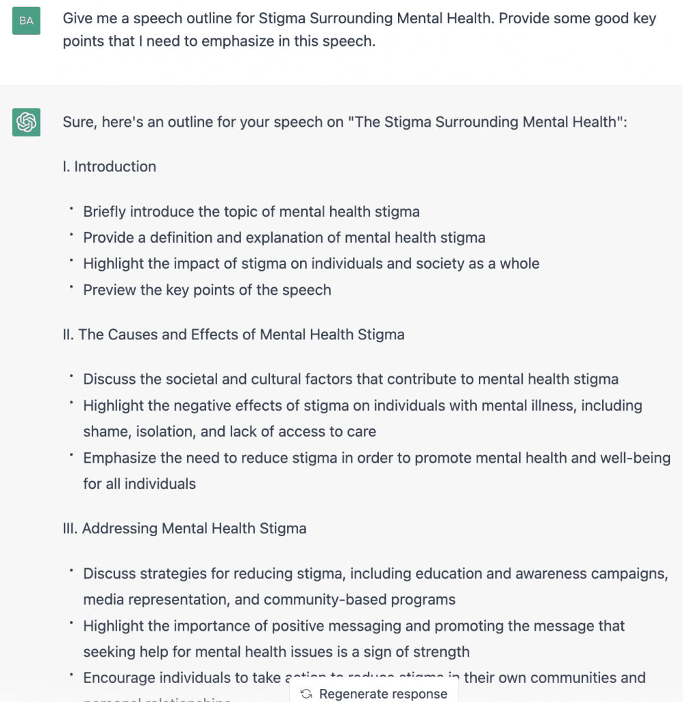 Once you’ve chosen a topic, ChatGPT can help you create an outline for your speech. This outline can include an introduction, thesis statement, supporting points, and conclusion. ChatGPT will use its expertise to provide a suggested outline that you can use as a starting point for your speech.