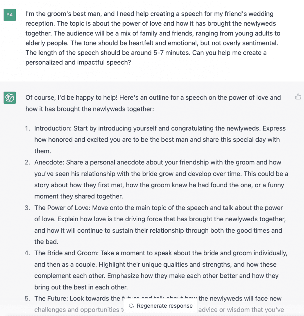 With the outline in place, ChatGPT can generate content for each section of your speech based on the details you’ve provided. ChatGPT will present you with a draft of your speech for each part, and you can review and modify the content as needed. This step will help you refine and personalize your speech to accurately reflect your ideas and voice.