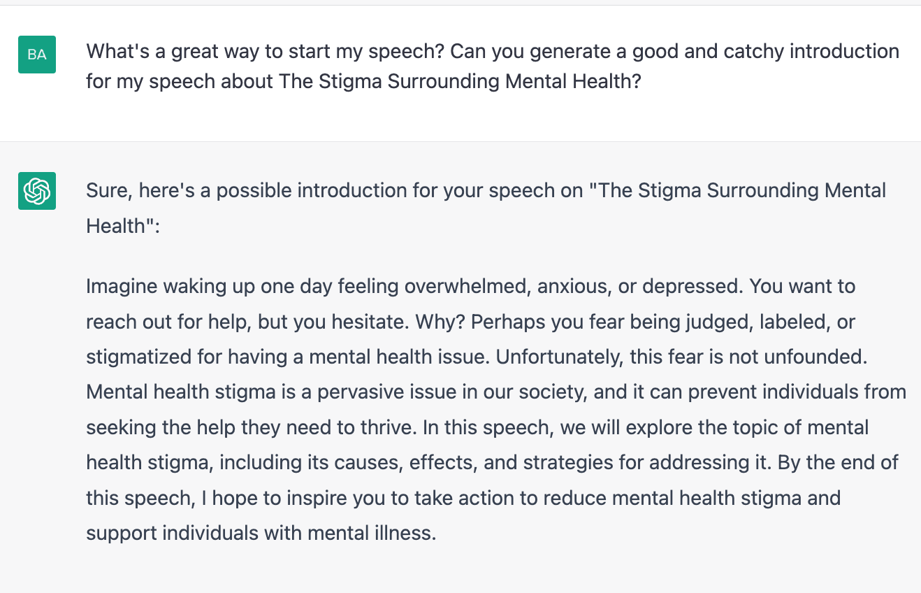 By using ChatGPT to write your speech, you can save time and create a speech that is tailored to your audience and purpose. Just remember to provide ChatGPT with all the necessary details and take the time to review and refine the output to ensure it meets your needs. Give ChatGPT a try today and take the first step toward delivering a memorable and impactful speech. Get ahead of the game and start using artificial intelligence with ChatGPT. Get answers, learn, and discover anytime. Start your AI journey. Learn moreUse ChatGPT to Make Effective Speeches and more!