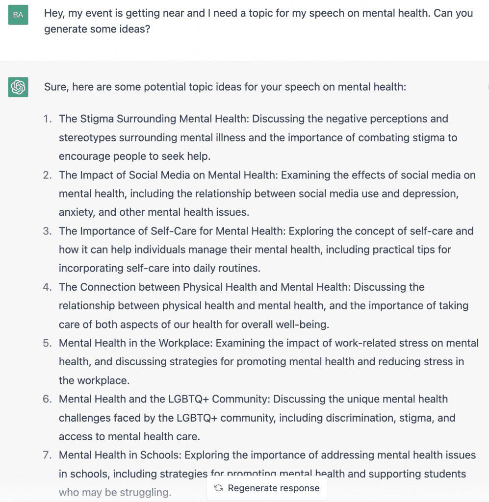 When struggling to come up with a topic for your speech, ChatGPT can offer assistance by generating topic ideas based on related keywords you provide. It’s essential to select a subject that you’re passionate about and can confidently speak on, and ChatGPT can provide a variety of options to inspire your creativity.