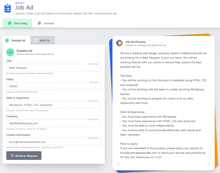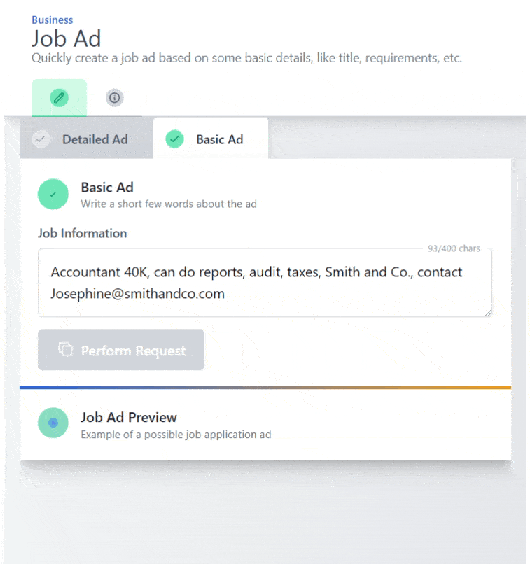 Use ChatGPT to assist you in creating the perfect job ad in minutes. Whether you're a small business owner or a human resources professional, the job ad maker feature will help you attract the best candidates for your job openings.
